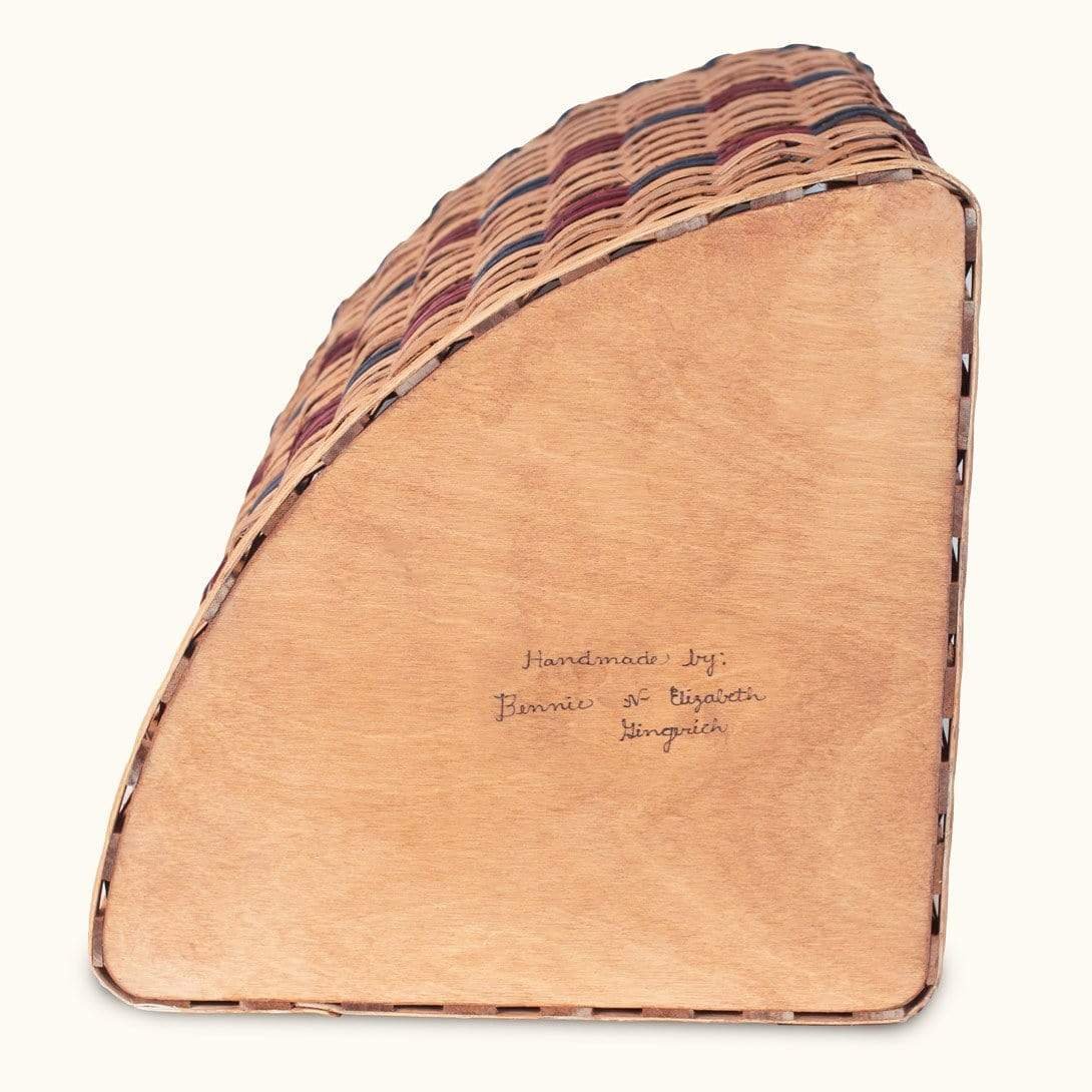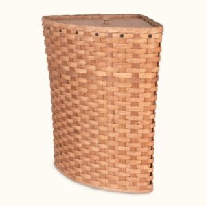 This large-sized Amish woven wood corner hamper comes complete with a removable lid. This all-natural large wicker laundry hamper has an oversized holding capacity yet its special space-saving corner hamper shape with lid lets you easily display and use this hamper in any room in your home. This basket’s big vertical shape combines with this large wicker laundry hamper’s strong internal wood frame to provide you with an enjoyable and functional laundry room gem that goes perfectly with any rustic, rural, farmhouse, or primitive interior design themes. This lidded corner hamper basket is handwoven in the Heartland of the US and is signed by the Amish crafter.