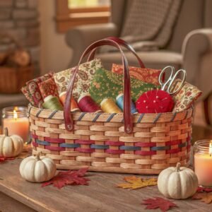 This handy, portable sewing storage and craft tote basket is handcrafted in a perfect size to keep your crafting supplies and sewing supplies organized and within easy reach no matter where you may need them. The vintage style of this woven wooden sewing caddy and craft tote features extra-wide leather carrying handles to make transporting your hobby and craft projects and tools easy and comfortable. Each basket is lovingly handcrafted from woven wood to be the ultimate storage basket for painting and drawing supplies, kids crafts, paper crafts, floral crafting supplies or any other hobby that requires a handy way to store, organize, and carry your needed supplies with you. Use this handy sewing and craft basket as a catch-all caddy for everything from craft parts, craft tools, sewing patterns, sewing fabric scraps, and anything you may need in your hobbies or crafts. This large classic sewing basket and portable craft caddy will add a one-of-a-kind look and feel to any room in your home. Whether you store this tote in your kid’s room to store kids’ crafts, next to your couch, on a tabletop, or next to your bed, you are sure to appreciate the timeless appeal of its rustic good looks and classic design. This handy craft caddy with carrying handles is handmade by Old-Order Amish families in the Heartland of the USA and comes with Free Shipping to anywhere in the contiguous United States. Contents not included. (Liner Sold Separately.)