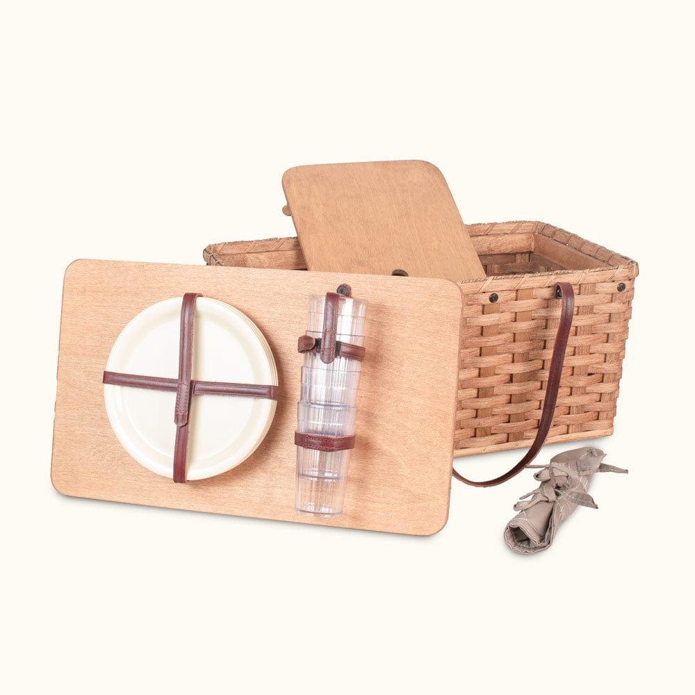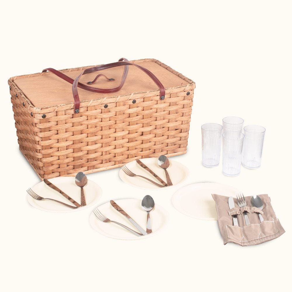 Built-In Picnic Serving Sets Now Available! Now you can have a complete custom picnic service set built right into your Amish handwoven picnic basket. Be ready for your next outdoor picnic, romantic rendezvous, or any other get-together on a moment’s notice by having one of these premium sets built into your large picnic basket. (See below for