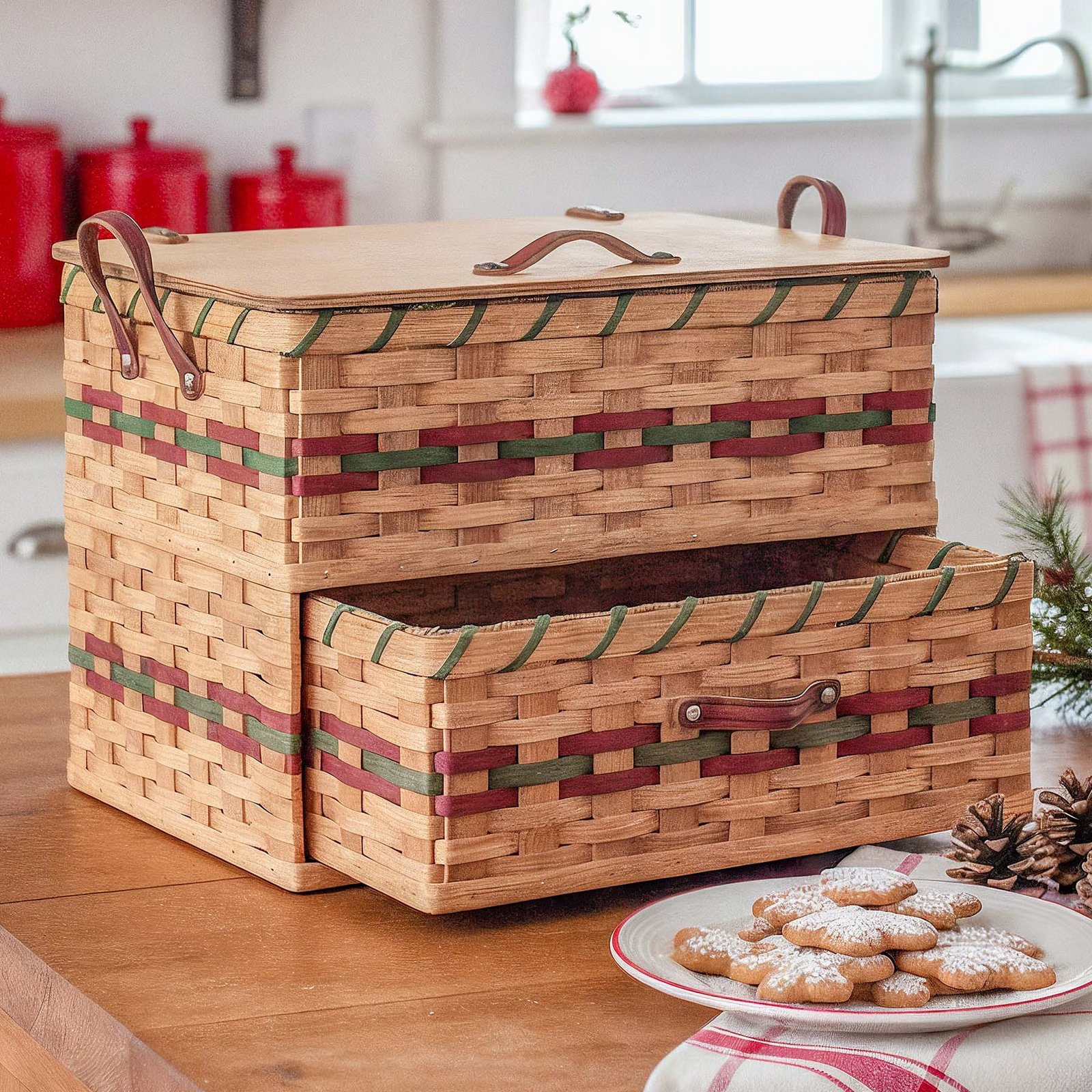 Double Storage Compartments!Oversized For Extra Storage Space!Warm Look With Leather Accents!Pull-Out Woven Basket Drawer!Compliments Any Home or Office!Crafted with Love by Old-Order Amish! This furniture-quality, handcrafted Amish bread box and kitchen countertop organizer comes complete with an extra 15 1/2″ x 10