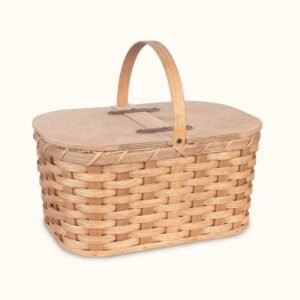 This wonderfully-convenient sized picnic basket with a double-sided lid is perfect for carrying your needed supplies to nearly any activity or event. This vintage woven wooden picnic basket comes complete with a solid wooden handle and hardwood lid and bottom to provide you with the ultimate in picnic basket durability and usefulness. This medium-sized picnic basket and classic design make it the perfect place to stow away your needed accompaniments for a summer trip to the beach or for having an outdoor lunch in the park or backyard. You are sure to find that this medium sized wicker picnic basket makes the perfect travel companion for camping, sporting events, outdoor concerts, tailgates or for any outdoor event that your travels may lead you to. Whether you’re looking for a convenient wicker basket to stow away your bbq picnic needs or to carry your dishes and supplies to your next potluck or family get together, this durable and versatile picnic basket is sure to suit nearly any of your picnicking, storage and travel needs. The overall height of 15″ includes the handle. The basket section on this picnic basket measures 8 1/2″ deep. This quality woven wicker medium picnic basket with lid is handcrafted by Old-Order Amish families in the Heartland of the USA and comes with Free Shipping to anywhere in the contiguous United States. Contents not included. (Liner Sold Separately.)