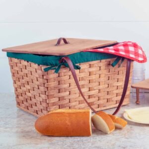 This Amish handmade traditional picnic basket provides a roomy area to stow away all your picnic goodies so they will stay secure while you travel to your favorite picnic spot. With this beautifully crafted basket’s internal divider, you can stow away lots of food and supplies and look forward to arriving at picnics, family gatherings, bake sales, or potluck dinners with all your goodies neatly tucked away inside. The leather carrying handles allow you to easily transport all your picnic needs safely. Hand-woven and signed by the Amish Crafter. This wicker picnic basket with leather handles also makes a perfect Mother’s Day, birthday, or Christmas gift idea. (Note: Cloth liners and picnic serving sets are sold separately.)
