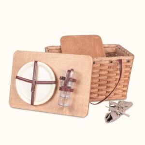 Built-In Picnic Serving Sets Now Available! Now you can have a complete custom picnic service set built right into your Amish handwoven traditional picnic basket. Be ready for your next outdoor picnic, romantic rendezvous, or any other get-together on a moment’s notice by having one of these premium sets built into your picnic basket. (See below for contents in the optional 2 or 4 person sets.) All contents are dishwasher safe and machine washable.