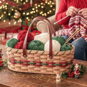 This vintage style knitting caddy and yarn storage basket is the perfect place to keep your knitting, crochet, and other craft or household items neat, organized and readily available in any location. The comfortable leather carrying handles on this knitting and crochet basket allows you to easily pick up your knitting and crochet projects and carry them to and from any location where you may have an opportunity to work on them. This travel caddy for knitting accessories is completely handwoven from authentic, all-natural materials and select hardwoods to provide the perfect basket to keep your knitting and crochet projects handy and organized. Keep this yarn knitting caddy storage basket next to your couch or chair and you will always be ready to knit or crochet on your projects at any time. With its generous amount of storage area, this knitting organizer is sure to become a trusted-companion no matter where your travels take you and it can even hold up to 3 of the oversized, one-pound skeins of yarn. This Yarn storage basket also makes the perfect gift to give to future generations as you hand down the heritage of old-world traditional craftsmanship to your children and grandchildren. This vintage organizational knitting tote and knitting needle caddy is handcrafted by Old-Order Amish families in the Heartland of the USA and comes with Free Shipping to anywhere in the contiguous United States. Contents not included. (Liner Sold Separately.)